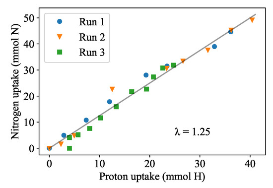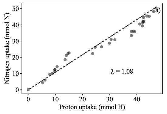 Results from batch experiments in 10% Hoagland’s medium where the pH was controlled at 6.5. The relationship between absorbed nitrogen and dosed protons (λ) was determined to be the same value of 1.25 mol N·mol−1 H as indicated by the common slope.