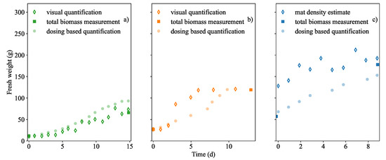 At partial coverage, a comparison between the visual-based quantification and acid dosing based quantification was made which is shown in Figure 3a,b. At full coverage the visual quantification was unable to accurately measure submerged biomass, thus the acid dosing based quantification was compared to the measured mat density which is shown in Figure 3c.