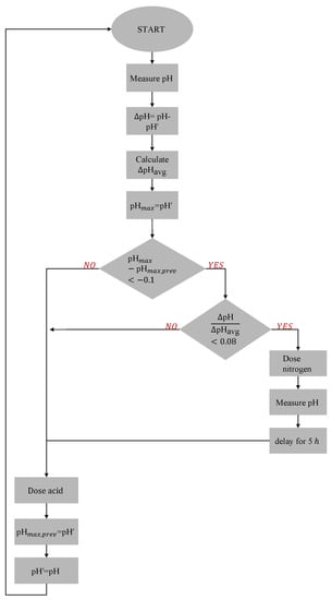 The control scheme for the detection of a low nitrogen concentration in the tank outlet is shown in Figure 4. The pH control relied on measuring pH between a rising slope and a descending slope. pH samples were taken 30 min apart. When a descending slope occurred between two pH readings, it was caused by an acid addition proportional to the difference between the measured pH and the setpoint. Between two pHs on the rising slope, no acid additions are made and the change in the pH was a result of the uptake by duckweed. For the detection of nitrogen depletion, the ratio of the absolute pH difference on the rising slope and the average pH change (ΔpH/ΔpHavg) was calculated and was used as a criteria for detecting when to replenish the nitrogen supply. The average pH change was based on a running average of ten pH maxima values and was updated every hour, except when dosing nitrogen. At N-depletion, a pump was turned on to feed into the tank. To avoid false indications, the control would only act if there was more than 10% reduction in the previously measured pH maxima (between a decreasing slope and rising slope).