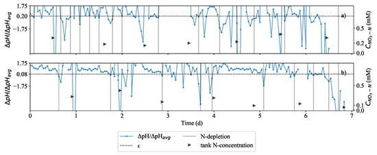 Comparative plot of experiment where the ratio between the absolute change in pH and the running average of absolute pH change (ΔpH/ΔpHavg). The threshold for this ratio was set to a value referred to as the depletion threshold (ϵ): 20% (a) and 8% (b). In (a) and (b) ΔpH/ΔpHavg was plotted for each case. When ΔpH/ΔpHavg dropped below ϵ, this was the point where the system indicated nitrogen depletion below detectable concentration for the plant. The nitrate-nitrogen concentrations were observed to be decreasing over time until minimum nitrate level was reached, 0.22 mM in (a) and 0.061 mM in (b) medium nitrate concentration despite regular feeding of fresh medium dosed at the times indicated on the plot.