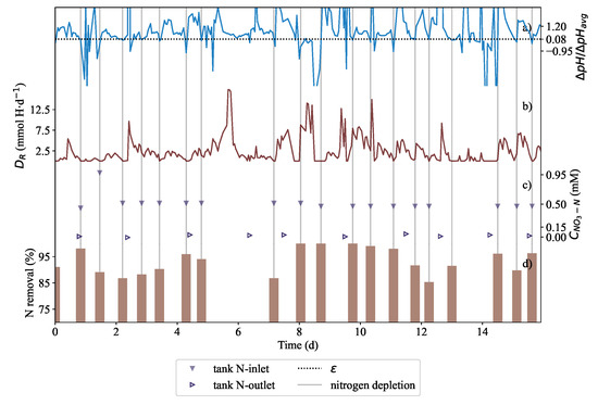 Results showing the nitrate-nitrogen removal in the phytoremediation tank. In subplot (a), showing ΔpH/ΔpHavg, at a 92% reduction or at the chosen ϵ of 0.08, nitrate was assumed to be depleted (vertical lines are depletion instances and also show when nitrogen was fed). (b) The rapid drops in DR correspond to the depletion of nitrate. As soon as nitrate was fed into the tank, DR rapidly increased. (c) Nitrate measurements showed that effluent nitrogen was maintained at critically low concentrations. Synthetic wastewater was fed into the tank containing nitrate at depletion/dosing instances. The inlet concentration of the feed is included along with the effluent concentration. (d) Shown is the total percentage of nitrogen removal by L. minor measured before nitrogen was dosed. The phytoremediation system achieved a high fraction of removal almost regularly every 10–14 h.