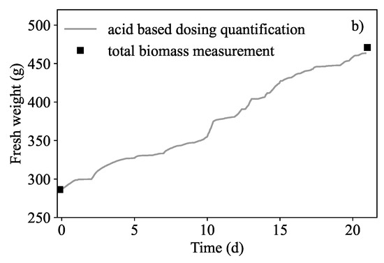 The total biomass amounted to 474.66 g wet mass which was an increase of 65.96% (compared to the starting biomass of 286 g which amounted to a relative growth rate of 0.017 d). It was found that the total nitrate nitrogen removed from the liquid amounted to 59.39 mg NO-N·g dry biomass and the nitrogen removed by the biomass was estimated to be 61.90 mg NO-N·g dry biomass. In addition, it was possible to show that biomass in the continuous system could also be predicted. Acid dosing based biomass quantification could be used to infer the amount of nitrogen extracted from the medium. This was determined similarly to how the acid dosing based prediction was found for the batch runs reported in Figure 3. A -value of 1.08 mol N·(mol) was found to fit better for this biomass prediction in Figure 7a. The prediction of the new biomass growth is presented in Figure 7b. The error between the dosing estimation and the measured biomass was 2.37%.