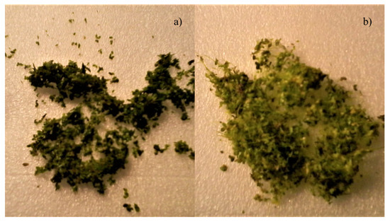 Images of L. minor from (a) before the run, fronds of the plant have very short or non-visible roots and are dark green in colour compared to the plant, and (b) after the run where fronds are lighter green in colour and roots are longer (vary between 1.5 cm and 4 cm). Individual fronds clumped together by longer roots.