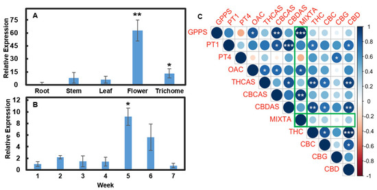 - Apicella, P.V.; Sands, L.B.; Ma, Y.; Berkowitz, G.A. Delineating the Genetic Regulation of Cannabinoid Biosynthesis during Female Flower Development in Cannabis sativa. Plant Direct, 2022; accepted. [Google Scholar]