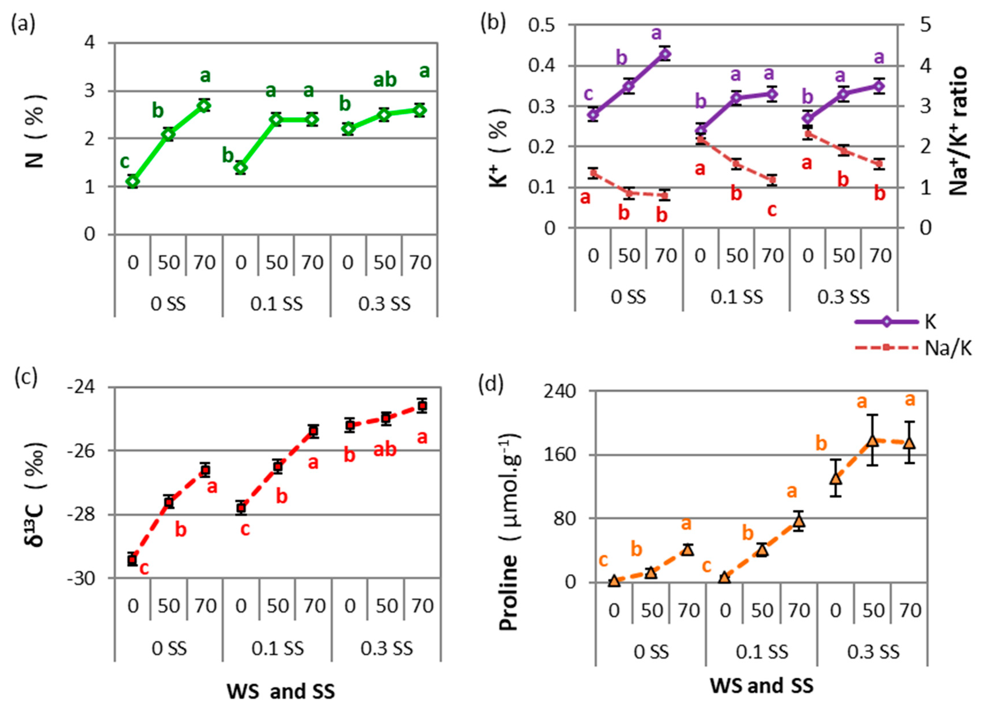 - Yousfi, S.; Serret, M.D.; Márquez, A.J.; Voltas, J.; Araus, J.L. Combined use of δ13C, δ18O and δ15N tracks nitrogen metabolism and genotypic adaptation of durum wheat to salinity and water deficit. New Phytol. 2012, 194, 230–244. [Google Scholar] [CrossRef]