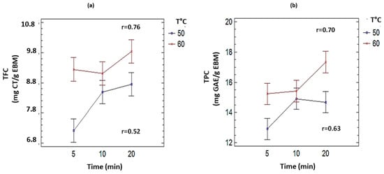 Relationship of temperature and time factors at different levels on (a) total flavonoids content (TFC) and (b) total polyphenol content (TPC). (r = Pearson coefficient of correlation). (p < 0.005).