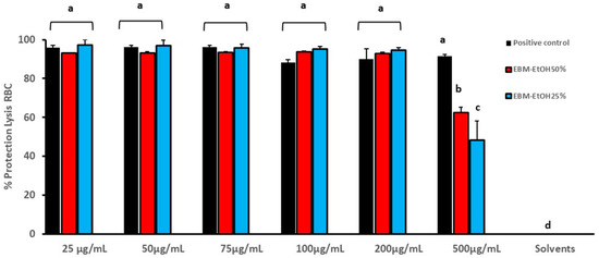 The anti-inflammatory activity of EBM-EtOH25% and EBM-EtOH50% was evaluated with RBC assay. EBMs were tested at concentrations of 25, 50, 100, 200, and 500 µg/mL. The diclofenac sodium standard was used as positive control. Figure 3 shows results of EBM-EtOH25% and EBM-EtOH50% anti-inflammatory activity by the RBC assay. The positive control (diclofenac) presents a value between (91.42–97.12%) of protection lysis RBC. EBM-EtOH25% and EBM-EtOH50% at 100 and 200 µg/mL present higher values than the positive control. Moreover, 100 µg/mL of EBM-EtOH25% presents a value of 93.70% and EBM-EtOH50% presents a value of 92.26%. EBM-EtOH50% at 25 and 50 µg/mL presents a higher value than the positive control. Only EBM at 500 µg/mL presents statistical differences of the samples compared to the positive control after analysis of one-way ANOVA at p < 0.05. But EMB-EtOH25% and EBM-EtOH50% at 500 µg/mL were less active than the positive control.