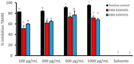 Figure 4 shows the results of EBM-EtOH25% and EBM-EtOH50% inhibition of lipid peroxidation in vitro. The samples were tested at concentrations of 100, 200, 500, and 100 µg/mL of EBMs. BHT standard was used as positive control. When the samples were compared to the positive control, they showed less activity than the positive control at all concentrations tested. At 500 µg/mL of BHT, the sample presented a value of 91.42%. The other samples showed a value of 77.00% in EBM-EtOH25% and 73.11% in EBM-EtOH50%. De las Heras et al. [56] have described ethanolic extracts of B. trinervis at a concentration of (100 µg/mL) with inhibition of microsomal lipid peroxidation of 74.80% of inhibition compared with control BHT (100 µM) with 100% of inhibition. Tapia et al. [57] reported extracts of B. grisebachii at a concentration of (500 µg/mL) with a capacity to inhibit lipid peroxidation in erythrocytes with values between 32–58% of inhibition. Our %TBARS inhibition values were higher than those reported in the previous study. Sabir et al. [49] have described the aqueous extract of B. trimera able to inhibit TBARS molecules, induced by different prooxidants (iron and sodium nitroprusside) in rat liver, brain, and phospholipid homogenates from egg yolk. Guimarães et al. [58] described glycolic extracts from B. dracunculifolia (GEBd) with capacity to inhibit lipid peroxidation in rat liver mitochondria. GEBd 0.03% presented a value of 75% of inhibition of TBARS molecules. The percentage of inhibition of lipid peroxidation values of EBMs are consistent with those reported in the literature for extracts from other Baccharis species.