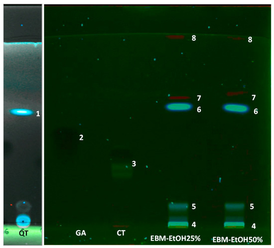 TLC analysis was made on a precoated silica gel 60 F254 TLC plate (Merck, Darmstadt, Germany) according to the method described by Khatoon et al. [39] with some modifications. Aliquots (6 µL) of ethanolic and methanolic EBM (15 mg/mL) and standards solutions (5 mg/mL of gallic acid, quercetin and (+) catechin) previously filtered (0.45 µm nylon membrane filters) were loaded on the activated plates as bands. The plates were developed in vertical glass chambers previously saturated with the mobile phase (toluene: ethyl acetate: formic acid) (40:40:2). After development, plates were dried at room temperature for 5 min and phenolic compounds were detected under UV light at 366 nm.