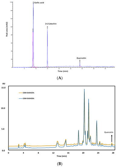 UHPLC analysis was performed using an UHPLC on Agilent 1200 infinity series UHPLC System (Agilent Technologies, Waldron, Germany) with an XDB-C18 (Agilent Zorbax Eclipse 4.6 mm × 25 cm × 5.0 µm of particle size) column and water-methanol as mobile phase. Ten microliters of extracts were injected and eluted at 0.8 mL/min with a linear gradient from 5–80% of solvent B (methanol) in solvent A (Milli-Q water) for 30 min, then an isocratic mode (80% of solvent B) for 10 min, and then a return to the initial conditions in 5 min. The temperature of the column was 20 °C. UV-Vis spectra were recorded at wavelength of 366 nm. Gallic acid, quercetin, (+) catechin standards were used for identification of phenolic compounds in EBM-EtOH25% and EBM-EtOH50% with their retention time used as a reference [40].