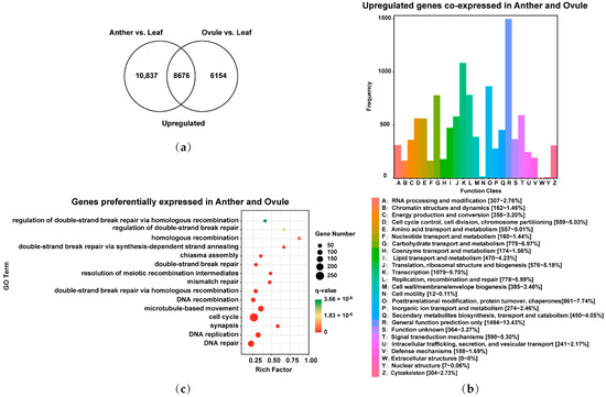 Identification and functional analysis of upregulated genes co-expressed and preferentially expressed genes in Anther and Ovule of Brassica allohexaploids: (a) Venn diagram showing the overlap of upregulated genes between Anther vs. Leaf and Ovule vs. Leaf; (b) clusters of orthologous groups (COG) classification of upregulated genes co-expressed in Anther and Ovule; and (c) gene ontology (GO) biological process pathway enrichment analysis of preferentially expressed genes in Anther and Ovule.