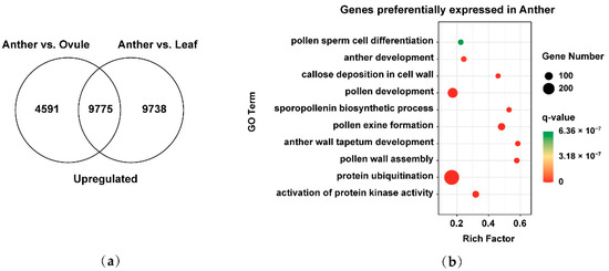 Identification and functional analysis of preferentially expressed genes in male gamete development of Brassica allohexaploids: (a) Venn diagram showing the overlap of upregulated genes between Anther vs. Ovule and Anther vs. Leaf and (b) GO biological process pathway enrichment analysis of preferentially expressed genes in Anther.