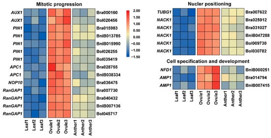 The expression patterns of mitotic progression, nuclear positioning and cell specification and development related genes in Anther, Ovule and Leaf of Brassica allohexaploids.