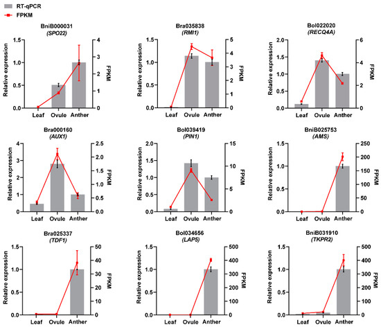 We further tested the reliability of RNA-Seq results by RT-qPCR. The randomly selected male and female gamete development-related genes BniB000031 (SPO22), Bra035838 (RMI1), Bol022020 (RECQ4A), Bra000160 (AUX1), Bol039419 (PIN1), BniB025753 (AMS), Bra025337 (TDF1), Bol034656 (LAP5) and BniB031910 (TKPR2) were verified by RT-qPCR. The results showed that the selected genes were positive by RT-qPCR (Figure 8). The expression patterns showed the same trend as that detected by RNA-Seq analysis (Figure 8).