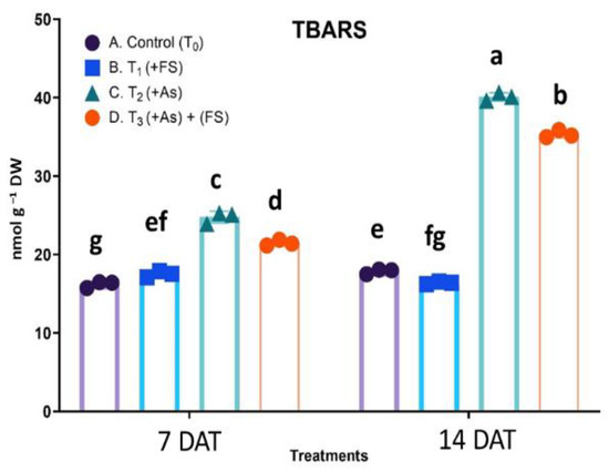 Oxidative stress was quantified in terms of thiobarbituric acid reactive substances (TBARS), for which a statistically significant interaction was obtained between treatment and days after treatment (DAT), F (3, 12) = 514.3, p < 0.0001. As stress (+As) increased TBARS content significantly by 53% and 125% over the respective controls at 7 DAT and 14 DAT. In combination (As + FeSO4) treatment, the rise in TBARS content was significantly lower than in As treatment, although still higher over controls (Figure 4).