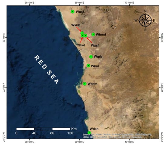 - Mansour, H.; Alsamadany, H.; Al-Hasawi, Z.M. Genetic diversity and genetic structure of Salvadora persica L., rare plant species in Rabigh province, Saudi Arabia: Implications for conservation. J. Taibah Univ. Sci. 2020, 14, 881–888. [Google Scholar] [CrossRef]