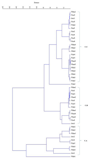 The cluster analysis is shown on a UPGMA dendrogram (Figure 2) subdivided into three main clusters. The first cluster, C.A., included all populations from Wadi Khurieba, as well as three populations from Gebel Al Twaal (Gtwl 1, Gtwl 2, and Gtwl 4), which exhibited the highest means of genetic variables; the remaining populations were distributed in the second cluster, C.B. and the third cluster, C.C. The second cluster contained three populations from the Wadi ALHamda site (Whmd 1, Whmd 2, and Whmd4) and two populations from the Wadi Al Khamas site (Wkhm 2 and Wkhm 3). The last cluster, C.C., had four populations from Wadi Dahban (Wdah 2, Wdah 3, Wdah 5, and Wdah 4), all the sampled populations of the Wadi Kuliayah site, three populations from the Wadi Al Nassayeif site (Wnsf 2, Wnsf 3, and Wnsf 4), and three populations from the Wadi Al Asaafer site (Wasf 2, Wasf 4, and Wasf 5), these sites showing the lowest values of genetic diversity variables and being geographically isolated from Wadi Khurieba and Gebel Al Twaal.