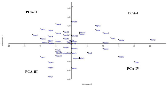 The PCA results (Figure 3) showed three out of seven principal components were significant (Eigen value >1) and contributed 99.9% of the total variation. The three significant components were Na, accounting for 73.4, F, accounting for 6.9, and P, accounting for 4.9. The PCA explains the variance among the studied sites, and it categorized the R. epapposum populations into four groups. Group PCA-I included the populations from Wadi Khurieba and Gebel Al Twaal that maintain favourable conditions of high altitude mountain and water reserves and that assist R. epapposum to maintain slightly higher genetic diversity parameters and variance than other populations in the remaining sites. This group includes: three populations of Wadi Khurieba, three populations of Gebel Al Twaal, and three populations of Wadi Qaraba; group PCA-II included three populations from Wadi Al Asaafer, two populations from Wadi Al Nassayeif, three populations from Wadi Kuliayah, and two populations from Wadi ALHamda; group PCA-III aggregates populations from sites in Wadi Dahban, Wadi Kuliayah, and Wadi Al Asaafer, where unfavourable environmental conditions pose negative effects on genetic diversity parameters, and it included three populations from Wadi Dahban, two populations from Wadi Kuliayah, two populations from Wadi Al Asaafer, and two populations from Wadi Al Khamas. The remaining populations from Gebel Al Twaal, Wadi Khurieba, Wadi Al Nassayeif, and Wadi Al Khamas were included in PCA-IV, which aggregated in this group due to declining genetic diversity parameters as a consequence of extra stress from overgrazing and human overutilization in these sites.