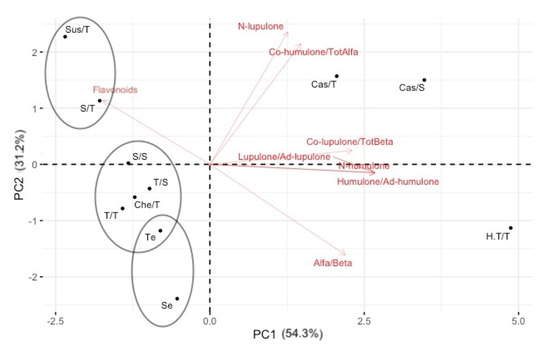 In order to have a graphical representation of the distribution of wild and cultivated hops based on phytochemical profiles, all quantitative variables measured were subjected to PCA analysis using R-based software. The first two major components (PCs) used in this study almost explain 87% of the total variance (Figure 1). The graphical representation shows the distribution of the samples along the two PCs and the contribution of the individual variables on the two PCs. In particular, it is possible to distinguish, in the two-dimensional distribution of the samples analyzed, the group of commercial hop varieties that tend to be placed in the right of the plot, as characterized mostly by high values of α and β acid as single components and also as α/β ratio. These are all parameters that together with total flavonoids contributed most to determine the first PC. The H.T./T commercial variety tends to deviate from the Cas group (Cas/S and Cas/T) especially for the higher α/β acid ratio (2.6 versus 1.3). Instead, the percentage of lupulone and cohumulone in total α acids variables was the one that weighed most in the definition of PC2.