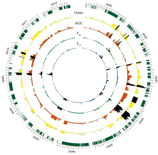 | QTLs | Chr | Intervial | Gmax | T50 | T10 | AUC | ||||||||