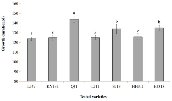 Seven japonica rice varieties were collected from the experimental field of Qiqihar Branch of Heilongjiang Academy of Agricultural Sciences in September 2021. As shown in Figure 1, the seven tested japonica rice varieties were divided into three GD types (p < 0.05). QJ1 had a longer GD (144 days) and was suitable for planting in the first accumulation zone of Heilongjiang Province. SJ13 and HJ313 had a medium GD (134–135 days) and were suitable for planting in the second accumulation zone of Heilongjiang Province. LJ47, KY131, LJ11, and HH311 had short GD (124–126 days) and were suitable for planting in the third accumulation zone of Heilongjiang Province.