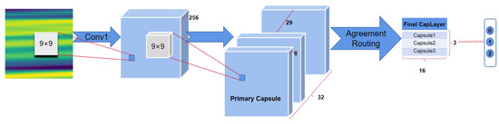 As shown in Figure 3, Conv1 is a normal convolutional layer, which has 256 output channels and 9 × 9 convolution kernels with a stride of 1 and ReLU activation. This layer extracts low-level features that are then used as inputs to the primary capsules, a convolutional capsule layer. This convolutional layer has 256 output channels and 9 × 9 convolution kernels with a stride of 2. The outputs are segmented into [32 × 8] vectors (primary capsules). Therefore, each primary capsule output sees the outputs of all 256 × 9 × 9 Conv1 units, which is a group 8D vectors in the 6 × 6 grid. The primary capsules contain advanced features. The length of the output vector of a capsule represents the probability that the entity represented by the capsule is present in the current input. The output capsule is computed using a nonlinear squashing function (Equation (2)) to ensure that the length of the vector is between 0 and 1. The third layer (final CapsLayer) has one capsule per class, and each of these capsules receives input from all the capsules in the layer below.