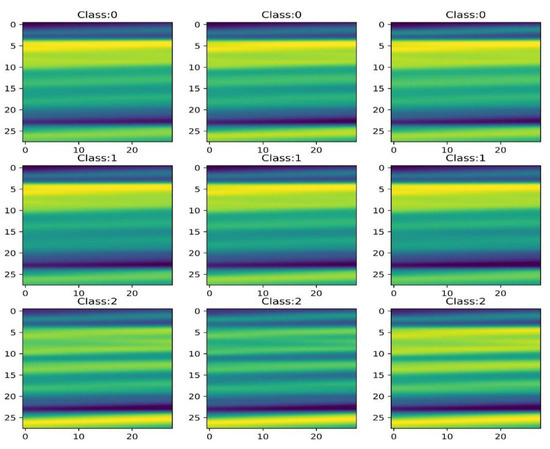In this experiment, two segmentation methods and one superposition fusion method were used to convert one-dimensional data to two-dimensional data, and 245 2D data of 28 × 28 were obtained. The imshow method [50] in the Python-based matplotlib package was used to complete the data visualization (Figure 8). Two-dimensional scalar data are presented as a pseudocolor image. The values were mapped to colors using normalization and a color map. Based on the fusion of local features and global features [51], the two-dimensional scalar data were transformed into two-dimensional visual image information, and the recognition rate of japonica rice GD identification was improved by taking advantage of CapsNets’ ability in image information classification [45].