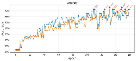 As shown in Figure 9, there was no significant change in the accuracy of the training datasets and test datasets when the training epochs were between 10 and 35. The accuracy of the training datasets and test datasets improved significantly when the training epochs were between 35 and 110. The accuracy fluctuated significantly when the training epochs were between 110 and 120. Finally, the accuracy converged to 86–92.85% when the training epochs were between 120 and 160.