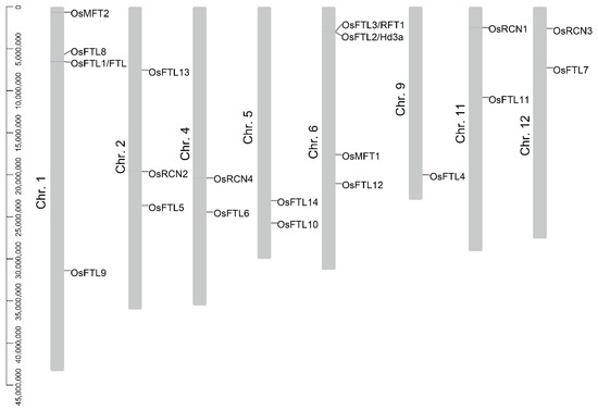 Distribution of OsPEBP genes on rice chromosomes. Bars in gray represent the rice chromosomes. The number on the left of the gray bars are the chromosome number. OsPEBP genes are labeled on the right of each chromosome. The ruler on the left is the scale bar measuring the length of chromosomes.
