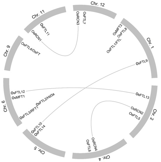 Syntenic analysis of OsPEBP genes in rice. Bars in gray show the rice chromosomes. Chromosome number is labeled on the peripheral surface. OsPEBP genes are labeled on the inner circumferential surface of each chromosome. The gray lines represent the colinear pairs of OsPEBP genes.