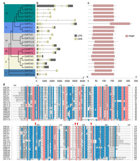 To explore the evolution of OsPEBPs, we constructed the phylogenetic tree of OsPEBPs with their amino acid sequences. The results show that the members of OsPEBP family in rice are divided into six clades (Figure 3a). Clade I consists of OsFTL14 and OsFTL8. Clade II consists of OsRCN1 to OsRCN4. Clade III consists of OsMFT1 and OsMFT2. Clade IV consists of OsFTL9, OsFTL10, OsFTL12, and OsFTL13. Clade V consists of OsFTL1/FTL1, OsFTL2/Hd3a, and OsFTL3/RFT1. Clade VI consists of OsFTL4 to OsFTL7, and OsFTL11 (Figure 3a).