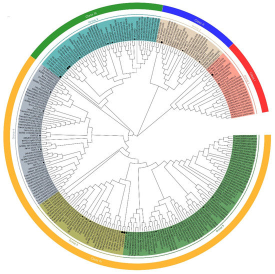 To reveal the phylogenetic relationships of PEBPs between rice and other crops, we constructed an unrooted phylogenetic tree using amino acid sequences of 262 PEBP proteins. The PEBPs are divided into six groups termed group 1 to 6, which belong to four classes, termed class I to IV (Figure 4). Group 1 to 3 are corresponding to class I to III, respectively. Group 4 to 6 are in class IV. OsFTL14 is in group 1. OsMFT1 and OsMFT2 are in group 2. OsRCN1 to OsRCN4 are in group 3. OsFTL8, OsFTL9, OsFTL10, OsFTL12, and OsFTL13 are in group 4. OsFTL1 to OsFTL3 are in group 5. OsFTL4 to OsFTL7, OsFTL11 are in group 6 (Figure 4).