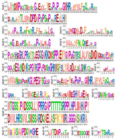 To identify conserved motifs in the PEBP protein family, the MEME program (http://meme-suite.org/, accessed on 19 April 2021) was applied using the following parameters: any number of repetitions; minimum 6 motifs; maximum 50 motifs; optimum 10–200 amino acids; expected E-value < 1*10-48 [92].