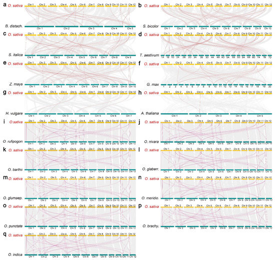 In addition, the syntenic association was also analyzed between rice and rice ancestors, such as Oryza rufipogon, Oryza nivara, Oryza barthii, Oryza glaberrima, Oryza glumaepatula, Oryza meridionalis, Oryza punctate, Oryza brachyantha, and Oryza indica. The number of the collinear pairs of PEBP genes between rice and its ancestors is 38, 33, 38, 40, 34, 34, 35, 40, and 38, respectively, suggesting conservation of PEBP gene family and the significant roles during evolution (Figure 6i–q).