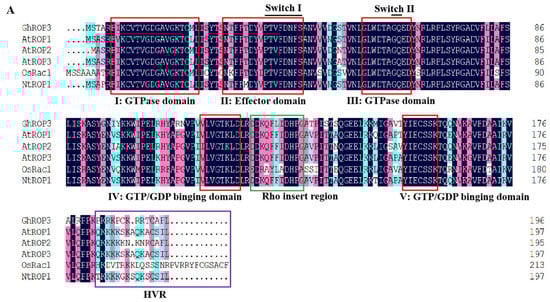 Multiple sequence alignments revealed that the GhROP3 protein contained five I–V effector domain motifs. Motifs I and II were GTPase-binding motifs, and motifs III–V were GTP- or GDP-binding motifs, besides two switch motifs (switch I and switch II), one Rho insertion motif, and the C-terminal variable region (HVR), which were in accordance with the structural features of ROP proteins in plants. The ROP protein C-terminal HVR region had a CAFL motif, conforming to the selectivity of GGB for the amino acid sequence C-terminal of substrate proteins (Figure 1A). The evolutionary tree analysis results showed that GhROP3 belonged to class I ROP proteins and might be involved in prenylation modification reactions, which were speculated to have interactions with GhGGB proteins (Figure 1B).