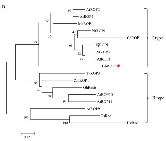 GhROP3 sequence analysis. (A) Multiple sequence alignment. (B) Phylogenetic tree analysis. Red star marks the target protein GhROP3.
