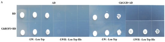 The ORF of GhROP3 was amplified via PCR, digested, and inserted into a pGBKT7 yeast expression vector to construct a pGBKT7-GhROP3 vector. Similarly, the ORF of GhGGB (MK105923) was amplified by PCR, digested, and inserted into a pGADT7 yeast expression vector to construct a pGADT7-GhGGB vector. The preparation, pGBKT7-GhROP3 self-activation detection, co-transformation, and culture of AH109 yeast competent cells were performed by previously described methods [42].