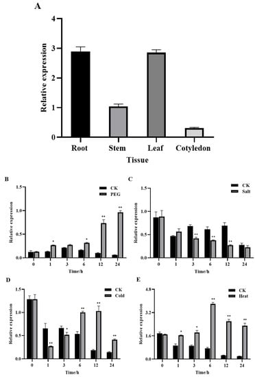 Upland cotton “Xinluzao 26” was grown as previously described [37]. When the second true leaf of the plant was fully unfolded, uniformly developed seedlings were collected and subjected to drought (15% polyethylene glycol (PEG) 6000), NaCl (200 mM), room temperature (25 °C, CK), cold stress (4 °C), and heat stress (37 °C) by the methods as described by Ni et al. [38]. The seedlings of water-treated plants served as controls. After treatment for appropriate times (0, 1, 3, 6, 12, and 24 h), the leaves from all the treated and control seedlings were harvested. Meanwhile, some seedlings were soaked in 100 µM ABA and IAA solutions for hormonal treatment. The seedlings treated with a trace absolute ethanol aqueous solution formed the control group. The true leaf tissues were taken after 0, 3, 6, 9, and 12 h. In addition, the roots, stems, leaves, and cotyledons under normal conditions were also collected for RNA isolation and used for tissue-specific expression analysis. The plant leaves at different times and tissues immediately frozen in liquid nitrogen were stored at −80 °C until further use. Each treatment was performed at least three times.
