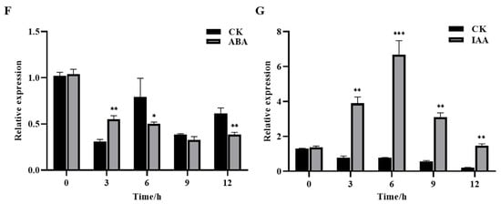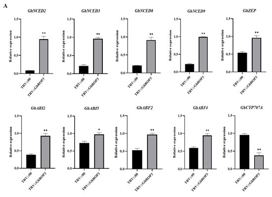 ABA synthesis-related genes GhNCED2, GhNCED3, GhNCED8, GhNCED9, and GhZEP; signaling pathway-related genes, as well as GhABI2, GhABI5, GhABF2, and GhABF4; catabolism-associated gene GhCYP707A; and IAA synthesis−related genes GhYUC2, GhYUC22, and GhCYP71A13; signaling pathway-related genes, as well as GhARF6, GhARF18-1, and GhARF18-5 were selected. qRT-PCR was used to analyze the transcript expression changes of the aforementioned genes. The relevant primers used in this study are listed in Supplementary Table S1.