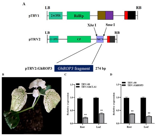 With reference to the open reading frame (ORF) sequence (591 bp) of the upland cotton GhROP3 gene (MK955930), the target sequence (274 bp) for repressing the expression of the target gene was designed using the online software SGN-VIGS (https://vigs.solgenomics.net/ (accessed on 30 December 2014), and PCR amplification was performed. The amplification product was ligated to the TRV2 vector to construct the recombinant vector TRV:GhROP3. Similarly, we selected the chlorophyll synthesis-related GhCLA1 gene and constructed TRV:GhCLA1 as a visual marker to monitor silencing efficiency [40]. TRV:GhROP3, TRV:GhCLA1, and TRV:RNA1 and TRV:RNA2 vectors were introduced into Agrobacterium tumefaciens GV3101 using the freeze-thaw method. The cotton seedlings were grown until both cotyledons were fully expanded and the true leaves just showed their tips. Then, uniformly grown seedlings were selected for VIGS infestation using the injection method. The activation, resuspension, and infection of bacteria were performed by the methods reported earlier [37]. The cotton plants infested with resuspensions containing TRV:GhROP3 and TRV:RNA1, TRV:GhCLA1 and TRV:RNA1, and TRV:RNA2 and TRV:RNA1 were used as the experimental group TRV::GhROP3, the positive control TRV::GhCLA1, and the negative control TRV::00, respectively. About 15 days after infestation, the roots and second true leaves of the experimental, positive control, and negative control plants were sampled. Three biological replicates of each sample were taken for RNA extraction and cDNA synthesis. qRT-PCR was used to detect the efficiency of gene silencing.