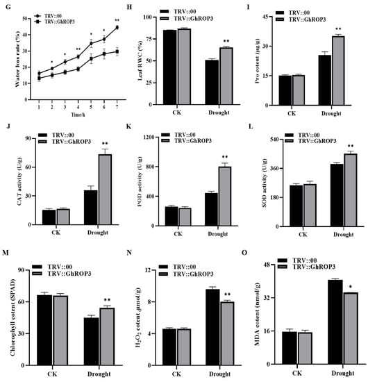 In addition, we measured several physiological indicators, including WLR; RWC; contents of Pro, Chl, MDA, and H2O2; and activities of CAT, POD, and SOD in plants under drought treatment and normal growth conditions. As shown in Figure 4G–O, the WLR from detached leaves was significantly lower in the TRV::GhROP3 plants than in the TRV::00 plants. Under normal conditions, no noticeable differences were found in these physiological parameters between TRV::00 plants and TRV::GhROP3 plants. After drought stress, the RWC, contents of Pro and Chl, and activities of CAT, POD, and SOD were significantly higher in the TRV::GhROP3 plants than in the TRV::00 plants. However, the contents of H2O2 and MDA in the TRV::GhROP3 plants were significantly lowered compared with those in the TRV::00 plants. These results indicated that the knockdown of the GhROP3 gene could enhance the tolerance of cotton plants to drought stress.