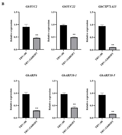 Analysis of the expression of genes related to ABA and IAA synthesis in true leaves of GhROP3-silenced and negative control plants. (A) ABA synthesis- and signaling pathway-related genes. (B) IAA synthesis- and signaling pathway-related genes. Statistical analyses were performed using the Student t test. Asterisks indicate a significant difference compared with the control. *, p < 0.05; **, p < 0.01.