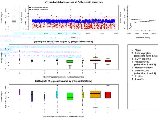 The search results for MLO proteins included 4474 and 3110 sequences from the UniProt and NCBI databases, respectively. Both datasets were merged and any duplicated sequences were removed. The final dataset included 5924 protein sequences, with lengths ranging between 9 and 1446 amino acid residues, a mean and median of 476.1 and 512, respectively, and first and third quartiles of 452 and 559, respectively. A graphical summary was used to examine the distribution of the sequence lengths within the dataset (Figure 1, top panel). The sequence lengths had a bimodal distribution with a high number of short outliers. Most of these short sequences represented incomplete protein sequences. Based on the graphical summary, the 15th and 99th percentiles (384 and 628.77 amino acid residues, respectively) were selected as the thresholds for the selection of sequences for further analyses. The sequences that were explicitly indicated as incomplete in the description header were also removed from the dataset.