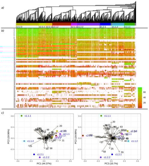 We distinguished the main clades of the tree on a hierarchical basis (two high-level superclades, four level two clades and nine level three clades), with the levels designated in the clade identifiers as separate numbers (e.g., c1.2.1). Although the classification of the sequences was limited to three levels, the final clades had their own substructures. Detailed plots of the identified clades are presented in the Supplementary Material (Figure S1). Using data from Kusch et al. (2016), we identified conformity between our clustering pattern and the previously described clades. We further referred to clades according to Kusch et al. by using their original numbering with Roman numerals followed by “K.” (e.g., I K., IV K., etc.).
