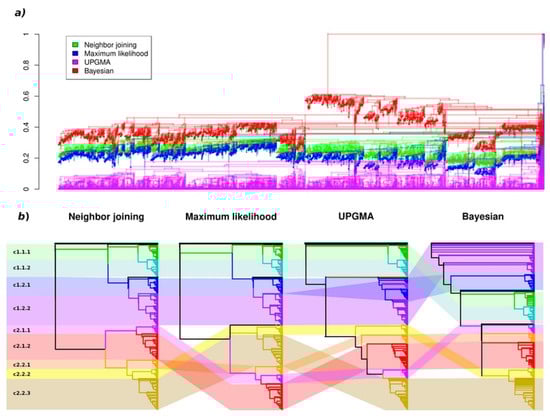 A comparison of the phylogenetic trees obtained using four different methods: (a) a superposition of the four aligned trees; (b) the consistency of the global topologies of the four trees.