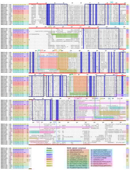 The MEME motif search was set for run parameters and resulted in 200 motifs with lengths of between 5 and 20 amino acid residues. The general MEME report indicated that the E-value of the identified motifs exceeded 0.05 before the middle point of the search. Thus, the obtained set of 200 motifs included all significant motifs under the specified search conditions.