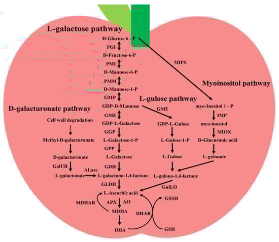 Aside from the above biosynthesis pathways, regeneration of AsA through the Foyer-Halliwell–Asada cycle is also an approach for AsA production [55]. Ascorbate peroxidase (APX) catalyzes the conversion of AsA to monodehydroascorbic acid (MDHA), which is then converted to dehydroascorbic acid (DHA) by a nonenzymatic disproportionation [3]. Ascorbate oxidas (AO) is an ascorbate oxidase, and part of AsA can also form MDHA under the catalysis of AO. Meanwhile, both MDHA and DHA can be converted to AsA by monodehydroascorbate reductase (MDHAR) and dehydroascorbate reductase (DHAR), respectively [3]. Much evidence has verified that DHAR positively controls AsA production in some horticultural crops, such as tomatoes and potatoes [56,57]. Although MDHAR also governs AsA regeneration, the expression level of MDHAR does not always coincide with AsA content. Transgenic plans are overexpressing MDHAR to decrease AsA accumulation, while knockdown of MDHAR gene decreases the AsA content [56,58,59]. However, overexpression of acerola MDHAR in tobacco significantly increases AsA content [60].