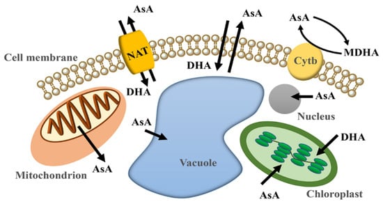 Although AsA is known to be synthesized in the mitochondrial inner membrane, AsA can also be detected in other subcellular structures, such as apoplast, chloroplast and vacuole, indicating the presence of AsA transmembrane transport [66,67,68] (Figure 2). At the outset, it is often assumed that AsA may be released from mitochondria into the cytosol via simple diffusion [69]. However, at physiological pH values, AsA has no membrane permeability [70]. Interestingly, it has been reported that mitochondrial ascorbic acid transporter from potato has unidirectional AsA transport activity, demonstrating the existence of transport proteins in mitochondria [71]. Currently, it is known that AsA is transferred from cytosol to chloroplast in a carrier-mediated manner [69]. In plants, AtPHT4;4 is the first chloroplast-localized ascorbate transporter identified from Arabidopsis [72]. In addition, some MDHAR and DHAR have also been shown to localize at chloroplast, suggesting that DHA can be taken up by chloroplast [73,74]. However, the mechanism of DHA uptake is still unknown. AsA utilizes concentration and pH gradients to enter the vacuole and thylakoid by passive diffusion [75]. Due to the missing AsA regenerated enzymes in the apoplast, AsA transport between protoplast and apoplast is necessary [66]. In mammals, AsA and DHA crossing the plasma membrane are mediated by Na-dependent transporters and glucose transporters [76,77]. However, the carriers that help AsA and DHA across the plasma membrane have not yet been identified [3]. Some nucleobase/ascorbate transporter (NAT) homologous genes have been identified and have functional redundancy according to the phenotype of multiple mutants. However, the regulation mechanism of NAT genes on AsA transmembrane transport is still unclear [78]. Furthermore, MDHA can reduce to AsA by accepting electrons from cytochrome b in the apoplast. MDHA can reduce to AsA by cytochrome b, which provides electrons from protoplast AsA oxidation [79].