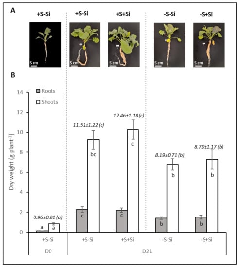 Representative pictures (A) and dry weights (B) of roots and shoots of Brassica napus L. plants cultivated in hydroponic conditions for 21 days (from D0 to D21) with (+S; 500 µM) or without sulfur (–S; 0 µM) and with (+Si; 1.7 mM) or without silicon (-Si) supply. Italic values indicate the whole plant biomass. Data are means ± SE (n = 4). Different Latin letters indicate that the mean dry weight of whole plant or of each plant compartment (roots or shoots) are significantly different (p < 0.05).
