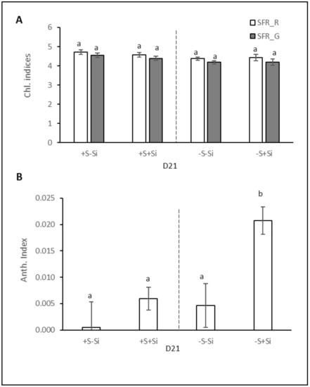 In agreement with several previous studies [35,36], an optical sensor (Multiplex®) was used to evaluate the chlorophyll and anthocyanin indices of Brassica napus leaves subjected to the different treatments (+S–Si; +S+Si, –S–Si, and –S+Si) for 21 days (Figure 2A,B). Regardless of the treatment, the chlorophyll (SFR_R and SFR_G) index remained constant (around 5) (Figure 2A). Figure 2B shows that when plants were fed with S (+S), silicon supply (+Si) there was no significant effect on the anthocyanin index of aerial parts. In contrast, in S-deprived plants (–S), silicon supply (+Si) significantly increased the anthocyanin index of aerial parts (from 0.005 ± 0.004 to 0.021 ± 0.003 in –S–Si and –S+Si plants, respectively). Moreover, our results indicated that a typical increase in the anthocyanin index in response to S deprivation was significant only when plants were fed with Si (+Si). This result correlates with the purplish coloration of leaves that can be observed in the –S+Si plants in Figure 1A.